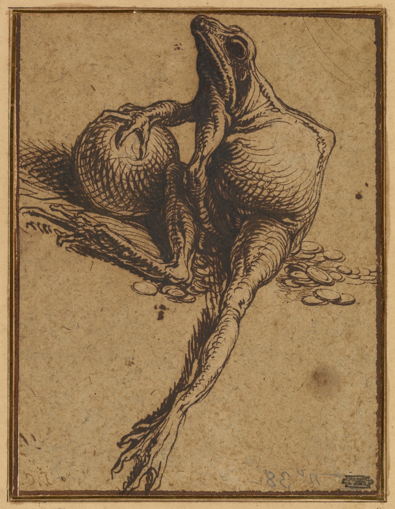 A Frog Sitting on Coins and Holding a Sphere; Allegory of Avarice by Jacob de Gheyn II